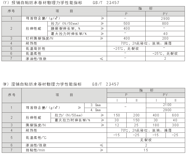 預鋪/濕鋪自粘防水卷材技術指標