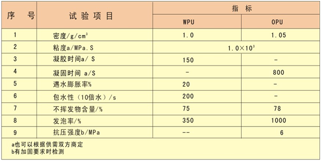 產品為單組分。使用時不需要加入溶劑和助劑,使用效果與水溶性聚氨酯相同。使用方便、止水效果好,不會燃燒,能安全運輸、保管和使用。 |